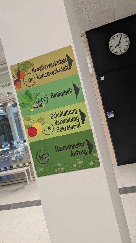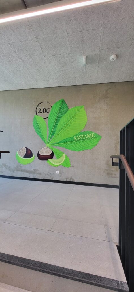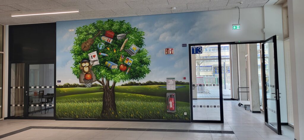 Der Einzug in das neue Schulgebäude ist abgeschlossen. Um dem Haus einen individuellen Anstrich zu verleihen, haben wir die Mittel bereitgestellt damit es tatsächlich eine „Grundschule unter den Bäumen“ wird. Allen ist bestimmt schon das tolle Wandbild im Foyer ins Auge gefallen. Jedes Compartment hat seinen eigenen Baum bekommen, der die Kinder am Treppenaufgang empfängt. Ebenso wurden Wegweiser designt.